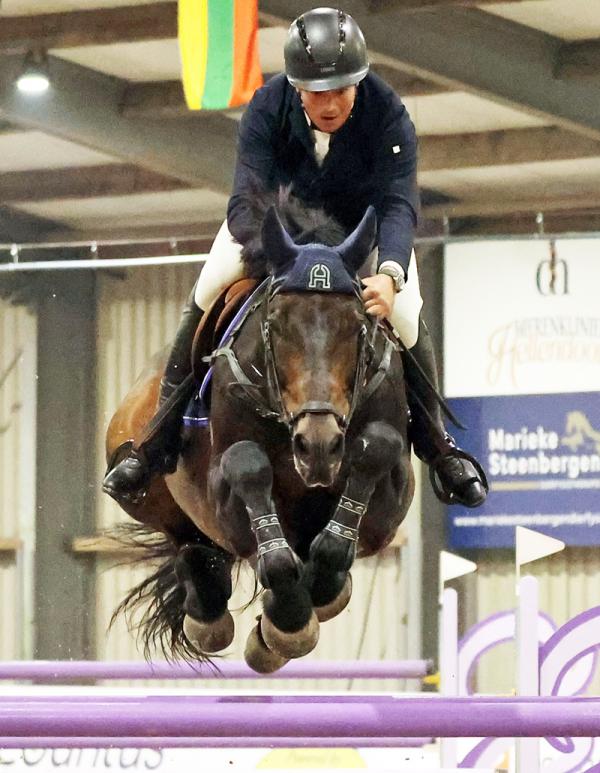 SAASVELD – Het springen in de Ankerhal van Saasveld leverde woensdag in de hoogste klassen fraaie zeges op voor Conor Drain met Drake Z over 1,35 meter en Gert-Jan Bruggink met Jager over 1,30 meter. (05-02-2026)