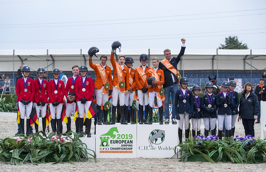Bondscoach Edwin Hoogenraat. “Dit is ongelooflijk mooi. Ik had al een heel goed gevoel in de weken voordat we naar dit EK gingen. Maar dat zegt niets. Hier moest het gebeuren. Het moet allemaal mee zitten en lukken. Het is gelukt. We hadden een heel goed voorseizoen met deze groep. Ze kunnen allemaal goed paardrijden, ze zijn er goed mee bezig en daardoor maken ze ook weinig fouten én ze hebben goede paarden. Alles viel op z’n plek vandaag. Een barrage hadden ze nog nooit eerder gereden. Dit is gewoon super. De childrensport is volwassen geworden, dat hebben we nu wel aangetoond. Luc Steeghs heeft dit een paar jaar geleden op de kaart gezet. Ik had geluk dat ik dit jaar zeven ruiters had, waar ik een team van kon smeden. We staan ook tweede in het FEI Landenklassement, dat zegt ook wat over deze groep.”